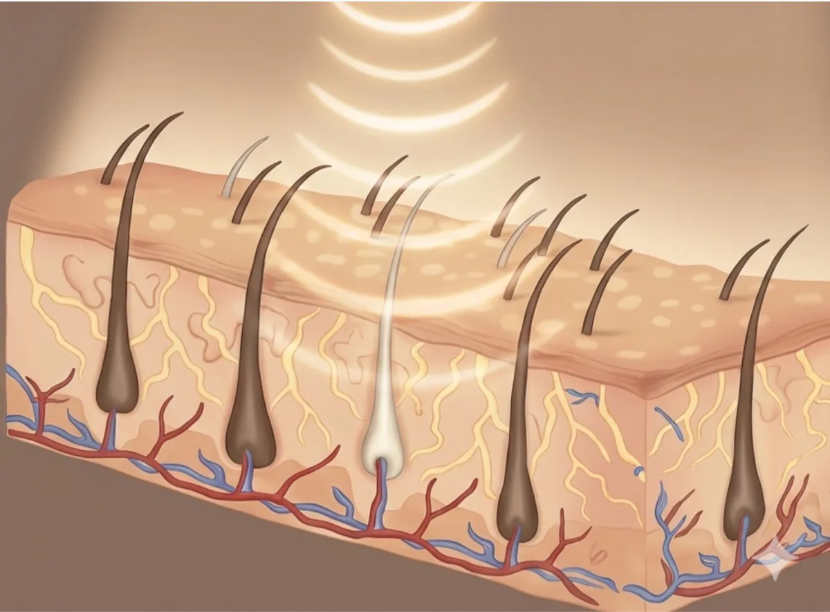 Die Kombination aus unserer sicheren Cosmo-Sonix®-Ultraschallwelle und dem hochfrequenten Licht (HFX) reduziert die Blut- und Nährstoff- zufuhr zum Haarfollikel langsam und schonend. Schon nach der ersten Sitzung wachsen Haare spürbar feiner und weicher nach.